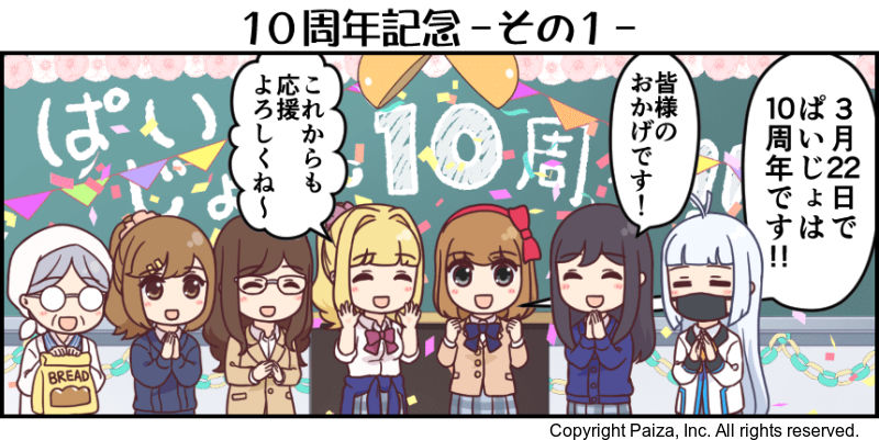 ITエンジニアを目指す女子高生たちの学園ライフ4コマ漫画 ぱいじょ! 第515話 「10周年記念 -その1-」