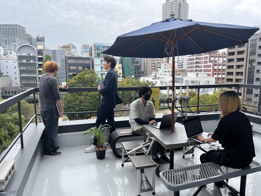 屋上は心斎橋アメリカ村すぐの堀江公園を眺めることができ、青空の下でMTGもできます。