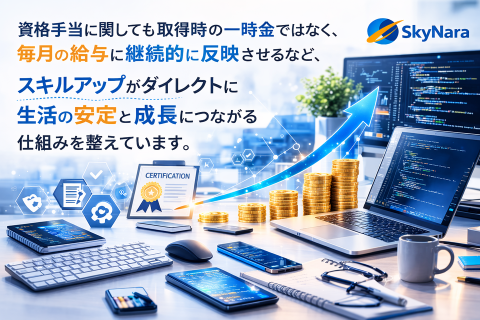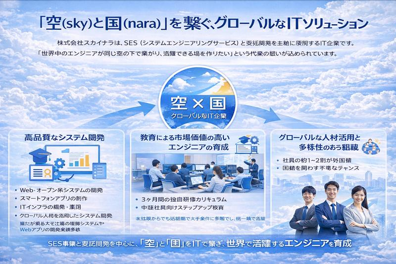 株式会社スカイナラは、SES(システムエンジニアリングサービス)と受託開発を主軸に展開するIT企業です。