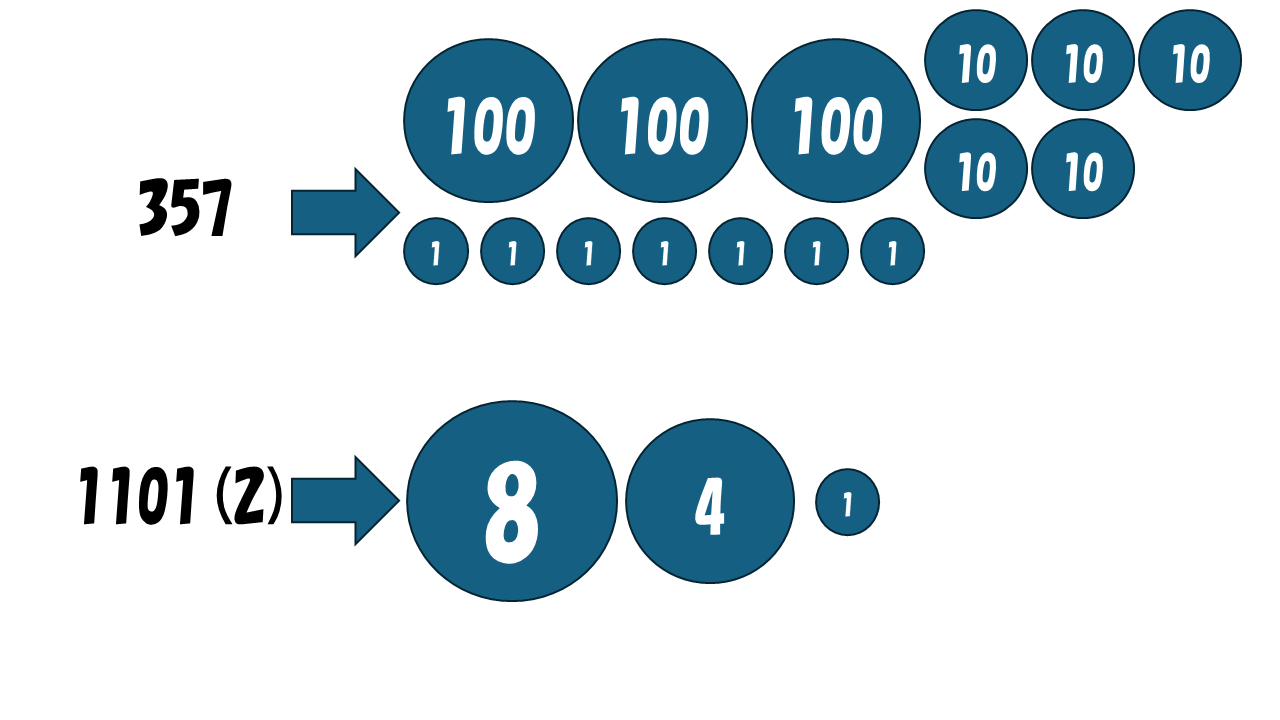まず、10 進数で考えます。357 について、一番右の 1 (= 10 ^ 0) の位は 7、左隣の 10 (= 10 ^ 1) の位は 5、さらに左隣の 100 (= 10 ^ 2) の位は 3 となっています。これは 10 ^ 2 が 3 個、 10 ^ 1 が 5 個、10 ^ 0 が 7 個で構成されていることを意味します。