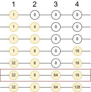 入力例 1 では電飾に LED が 4 つ付いており、信号は 7 つ送られます。 N 個の LED が初めて同時に点灯したのは 6 つ目の信号が送られたときで、そのときの LED の明るさの合計は 32 + 8 + 64 + 16 = 120 なので 120 と出力してください。