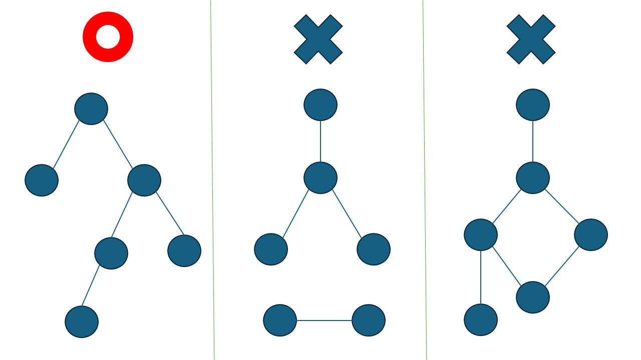 下の例でいうと、1 番左のグラフは連結成分が 1 であり、閉路を持っていないので木です。しかし、真ん中のグラフは連結成分が 2 であり、右のグラフは閉路を持っているため木ではありません。