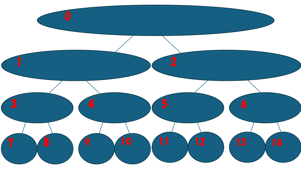 根を頂点番号 0 とし、頂点 i の左の子が頂点 2 × i + 1, 右の子が頂点 2 × i + 2 となるように番号を振っていきます。