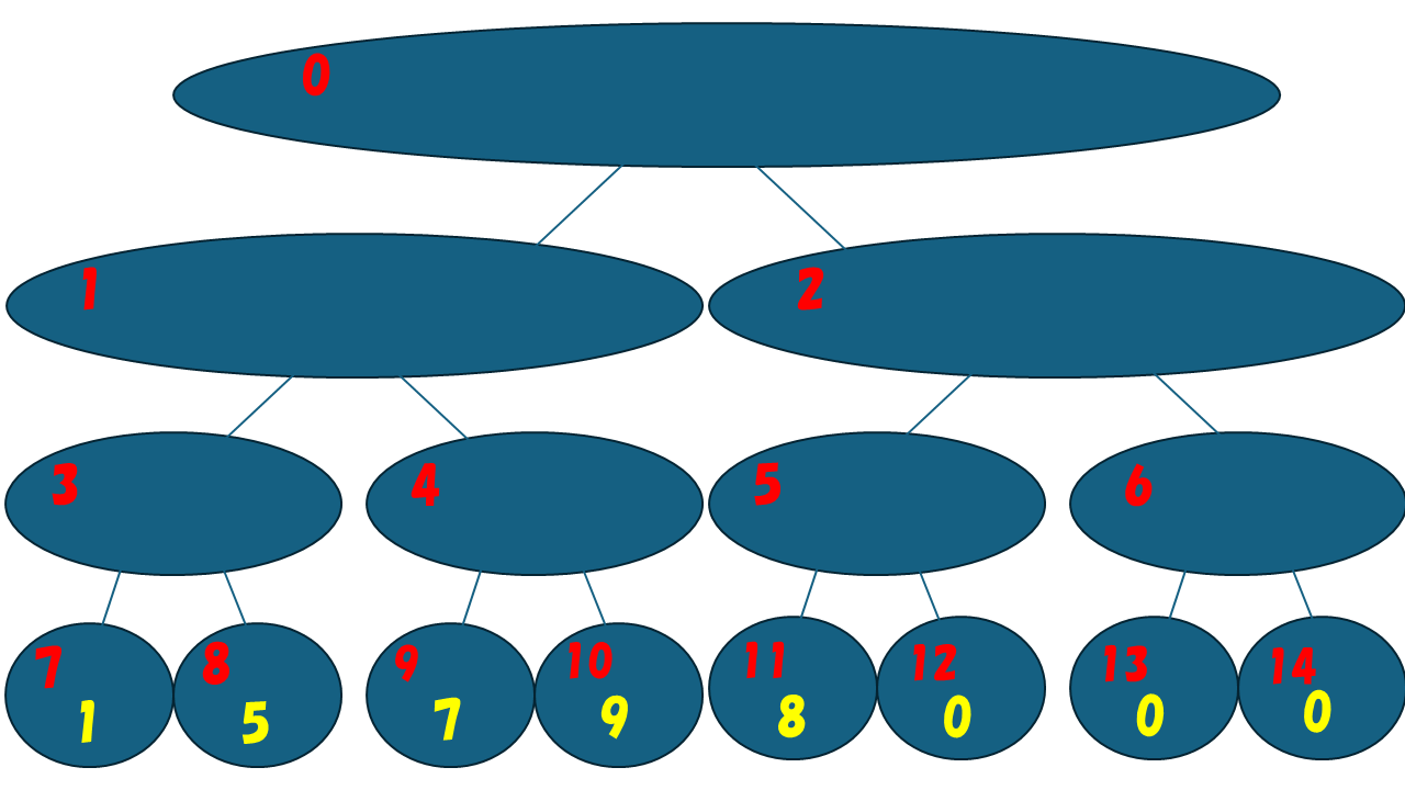 木の状態で管理するのは難しいため、実装では配列 (以降 Tree とする) で管理することとします。Tree の長さは完全二分木の頂点数とし、Tree の i 番目の要素は頂点 i に載せたデータを入れればよいです。この例では Tree = [9,9,8,5,9,8,0,1,5,7,9,8,0,0,0] となります。