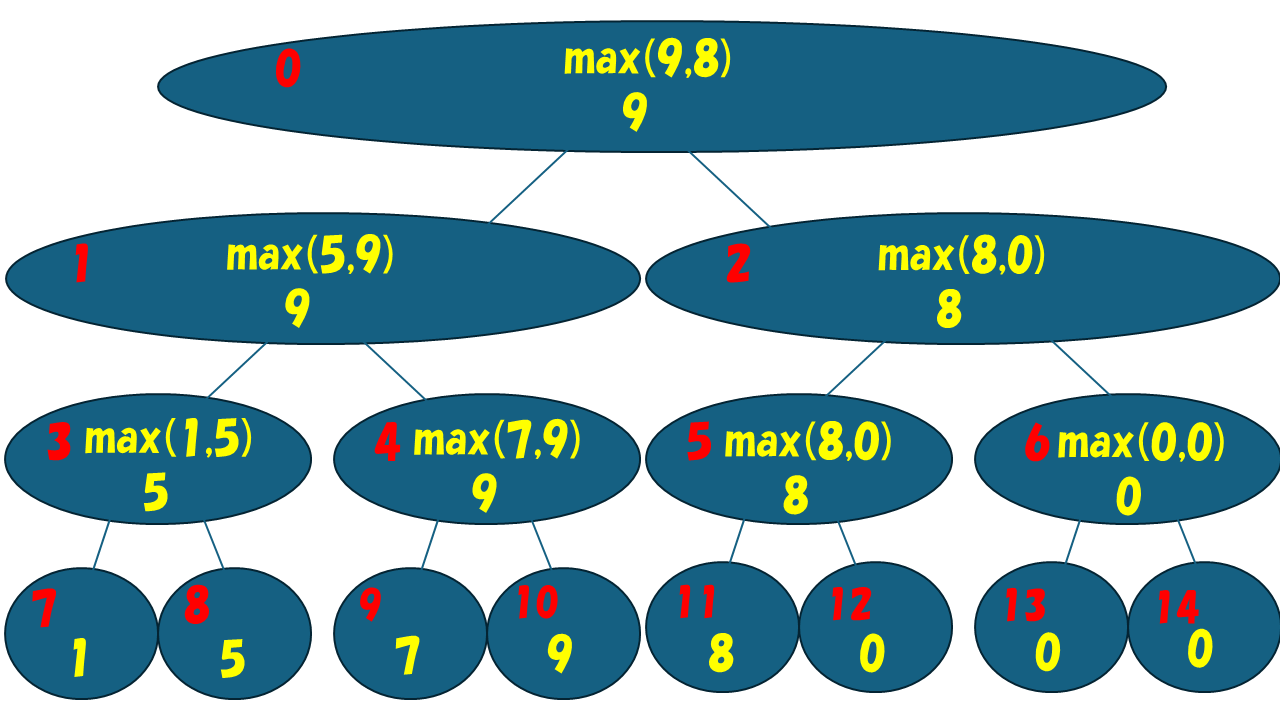 葉以外の頂点については、2 つの子についてmax演算を行った結果を載せます。具体的には、頂点 i には、max((頂点番号 2 × i + 1 のデータ),(頂点番号 2 × i + 2 のデータ)) を載せます。このとき、計算順序としては、子の要素が確定していなければいけないので、葉に近い順、つまり、番号が大きいほうから計算していけばよいです。